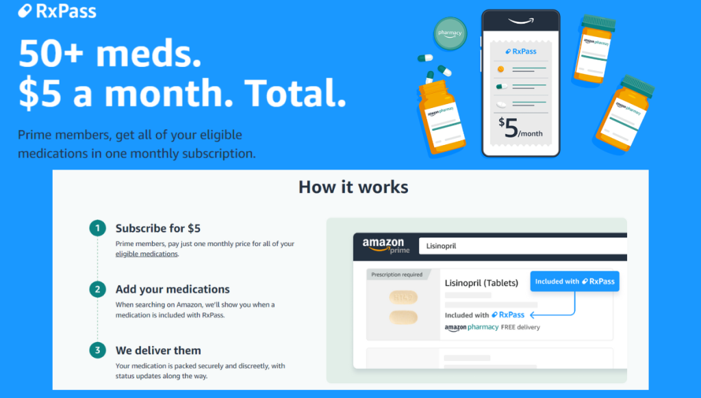 - RxPass: An exclusive subscription service for Prime members, offering unlimited access to a list of eligible medications for a flat fee of $5 per month, further simplifying the cost of ongoing prescriptions.